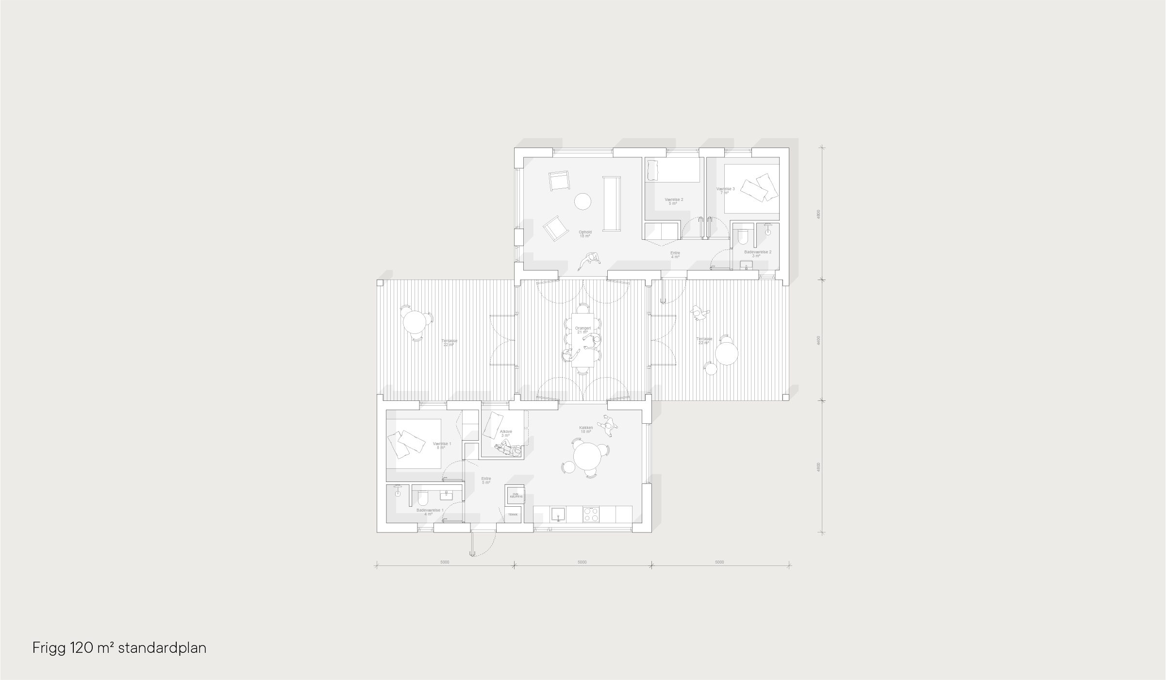 Delesommerhuset Frigg™ er udviklet med et skalerbart orangeri som boligens centrale leverum, hvilket gør det muligt at nyde friheden sammen og alligevel hver for sig. Huset kan opbygges med et eller flere 48 m² moduler i forlængelse af orangeriet.